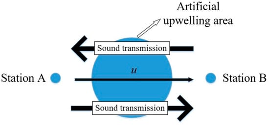 When sound travels between two points in water, it is affected by the flow velocity and the temperature of the travel path, resulting in different travel times in different directions. As shown in Figure 2, points A and B are two observation sites, while u is the flow component along the direction of the straight line (extending from A to B). The travel time can be obtained as follows: