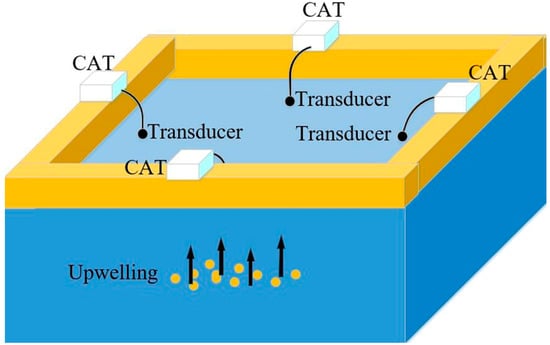 As an application of ocean acoustic tomography (OAT) in coastal areas, coastal acoustic tomography (CAT) has emerged as a new observation technology [8,9]. It could achieve a large range of velocity and temperature field observations and meet the long-term, real-time requirements of the field observations needed [10,11,12,13,14]. Underwater Wireless Sensor Network (WSN) can also achieve temperature field observations. It requires large numbers of sensors in order to provide environmental sampling. This indicates that deployment of WSN would incur more time and possibly higher costs. Moreover, these mobile sensors can easily float along with ocean currents and can hardly observe a fixed area, such as an upwelling area [15]. Thermocouples, resistance temperature devices (RTD), capacitance thermometers, etc., are all unable to obtain temperature field observations, and infrared thermography requires optical solutions which are not preferred, due to their short transmission distance underwater [16]. Acoustic thermography could detect changes in deep-ocean temperature, but depend heavily on an unusually stable acoustic feature in deep-ocean propagation, which can hardly be used at an offshore artificial upwelling area [17]. Overall, the CAT method is able to obtain the temperature field of an artificial upwelling area and observe the temperature distribution and the temperature changes of such areas, which is difficult to achieve using other observation methods. Some researchers have previously conducted CAT-based upwelling observation studies. Carriere from Free University of Brussels observed local coastal upwelling in Brazil’s Cabo Frio region in 2009, assimilating the obtained acoustic data into a feature model that continuously updated the prediction of the temperature field of the upwelling. The results demonstrated that the continuous tracking of the upwelling condition with the Set Kalman filter (EnKF) was better than that of the extended Kalman filter (EKF) [18]. Zhang et al., from Hiroshima University, used CAT to observe the upwelling caused by typhoons at Hiroshima Bay in 2013, and successfully obtained results consisting of temperature field, flow field, and salinity distribution of the observed area [19,20]. However, none of the above experimental observation targets relate to artificial upwelling. Additionally, they rarely perform the observation of upwelling in a small region.