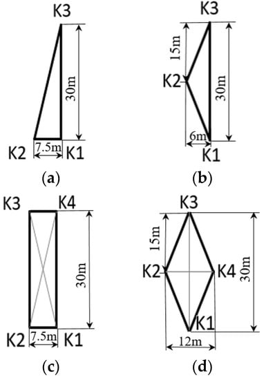 Four different station layouts. (a) Right triangle layout; (b) Isosceles triangle layout; (c) Rectangular layout; (d) Lozenge layout.