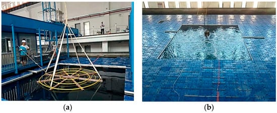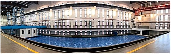 The experiments were conducted in the anechoic tank at Zhejiang University, as shown in Figure 5. The anechoic tank, with a length of 50 m, width of 15 m, and depth of 10 m, was used to simulate a marine sound environment, and was free from disturbances to measure a variety of acoustic parameters. Its band coverage is between 1–100 kHz. A sliding experimental platform was installed above the anechoic tank. Thus, it allowed the release of the transducer, positioned the station accurately, and helped in acquiring the experimental data.