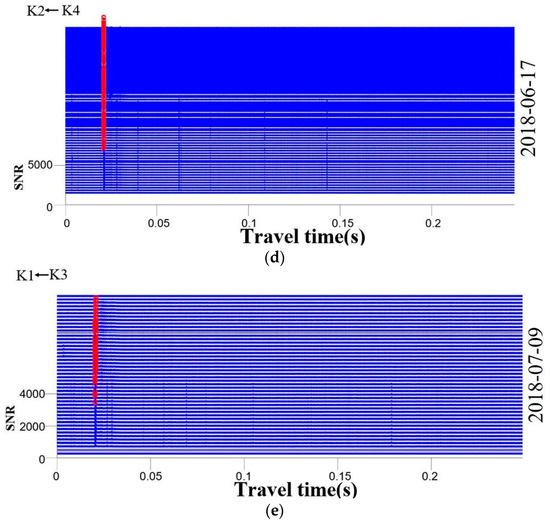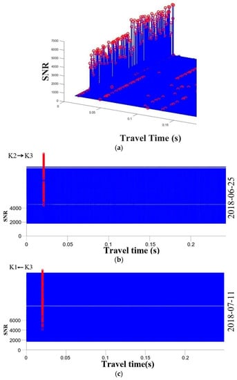 The signal correlation is performed to obtain travel time from the collected data in the experiment. Figure 7 displays the travel time for different layouts after cross-correlation. We take a three-dimensional plot of travel time for the right triangle layout as an example (shown in Figure 7a) to explain. The red circle is the point with the highest SNR for each set of acoustic signals. The SNR of the correlation peak is significantly higher than the other positions, and the travel time can be accurately identified. As shown in Figure 7b–e, the travel time for different layouts could be obtained after eliminating the wrong circles. In addition, the number of signals in Figure 7e is significantly lower, possibly due to a weak indoor GPS signal. This might lead to the CAT instruments becoming desynchronized and further the loss of data. Overall, the quality of the collected data was regarded satisfactory and sufficient for subsequent data processing.