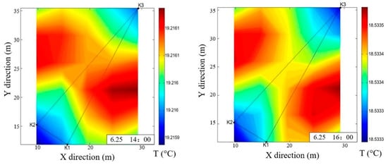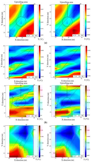 After obtaining the travel time, we use the inversion method to map the temperature field. The resulting horizontal temperature field for each station layout is displayed in Figure 8. When the upwelling is in progress, its position is marked with a dashed circle in the figure. In each station layout, the results before starting the upwelling and during the upwelling are presented with 2-h intervals. For example, for the right triangle layout, the horizontal temperature field is mapped at 14:00, and 16:00 with no upwelling, and at 18:00 and 20:00 with upwelling occurring. In addition, to prevent the effect of regularities in the station layout, the calculated domain was rotated by 45°. Therefore, the coordinates in Figure 8 represent those after rotating the original width and length direction of the tank.