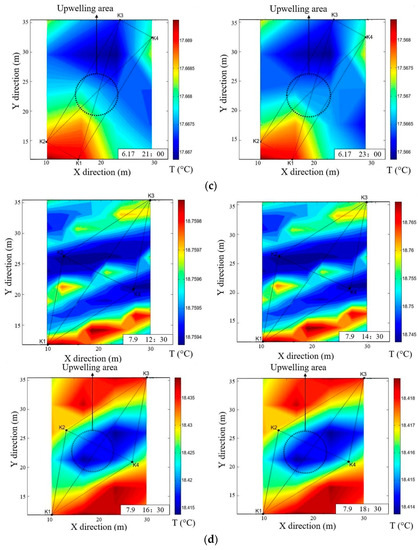 - It is most obvious in Figure 8d that the temperature in the upwelling area is much lower than its surrounding area. Compared with Figure 8a,b, the number of stations in Figure 8d is 4; compared with Figure 8c, the station spacing of Figure 8d is larger. We conclude that increasing the number of stations and station spacing may help to improve the accuracy of the temperature mapping.