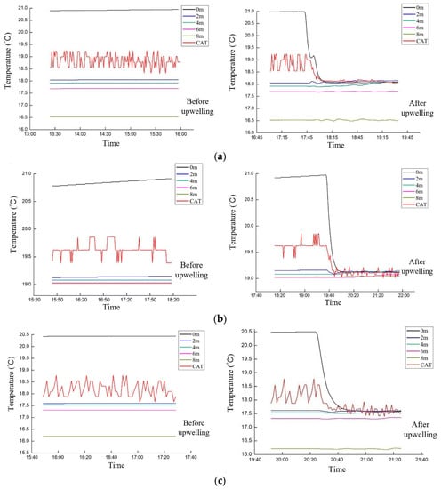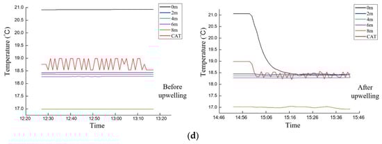 - After the upwelling, the CAT observation results are approximate to the water temperature at the surface. Before the upwelling begins, temperature from CAT observation fluctuates and remains within a certain range. After the upwelling, the temperature begins to drop, but stabilizes as the water flow with different depths is mixed. The temperature change captured by CAT before and after the upwelling is approximately 1 °C.