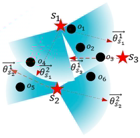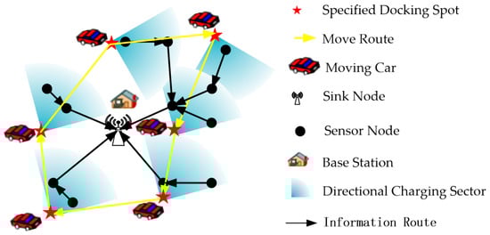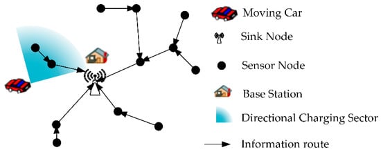 Wireless power transfer is a promising technology to replenish energy to sensors in Rechargeable Wireless Sensor Networks (RWSN), to keep the network working continuously []. Wireless Power Transfer (WPT) is mainly using magnetic resonance coupling [,,] or RF radiation technology [,]. To achieve efficient energy transfer in RF radiation technology, it generally requires directional transmission by using high-gain and directional antennas for power transmitters and receivers to focus the energy in narrow energy beams []. It has a more stable and higher efficiency of power transfer compared with omnidirectional charging []. Consequently, in the mobile directional charging scenario in RWSN, a rechargeable sensor can only receive power from a mobile charging vehicle equipped with a directional power transmitting antenna, or called directional charging vehicle (DCV), when they are located in the covered sector of the DCV’s directional antennas.