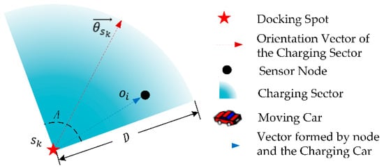 As shown in Figure 2, we introduce the DCV’s directional power transfer model as follows. When the effective charging distance of directional charger is and charging coverage angle is A, the effective charging coverage area is a sector determined by its docking spot and charging orientation vector .