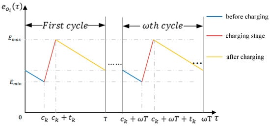 The variation of node’s residual energy value in a cycle is divided into three stages: 1) before charging; 2) charging stage; 3) after charging. For a sensor node , varied in a charging cycle T as shown in Figure 5. denotes the arrival time of the DCV at docking spot in the first cycle T, denotes the DCV’s dwell time at docking spot .