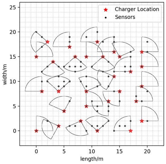For grid points on the discrete 2D plane, we get the vertex set of grids: , is coordinates of vertexes. We have to choose a set of candidate docking spots , and their corresponding charging direction , where has possible charging directions. We use denotes the maximum coverage utility of the set S of candidate docking spots as Equation (14).