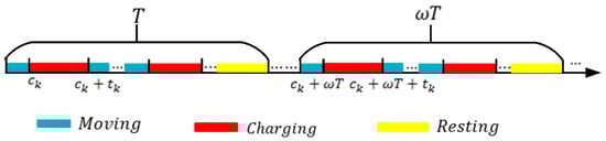 In a charging cycle T, the DCV’s energy consumption includes moving and charging energy, denote as and respectively. Charging consumption is determined by charging time and the DCV’s output power . Moving energy consumption is determined by the length of path and its energy consumption per unit of moving length . Then the DCV’s Energy Consumption, is denoted as Equation (9).