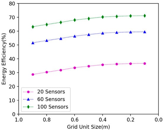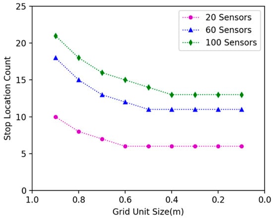 In our approach, we discretized the continuous 2D plane with gridding. We investigated how grid size affects the algorithm’s performance. We randomly deployed 20, 40 and 60 nodes in the 15 × 15 m2 area, changed the grid size, and explored the variation of energy efficiency and docking spots number. Figure 10 shows that with the decrease of grid size, the energy efficiency of the DCV increase. Additionally, a stable grid size tends to be 0.2 m. Figure 11 shows that with the decrease of grid size, the number of specified docking spots decreases. Additionally, it tends to be stable when grid size is .2 m.