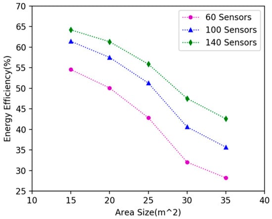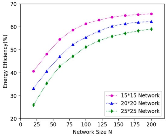We investigated how network size affects the algorithm’s performance. We randomly deployed 20, 40, 60, 80, 100, 120, 140, 160, 180, 200 nodes in 15 × 15 m2, 20 × 20 m2, 25 × 25 m2, 30 × 30 m2, 35 × 35 m2 plane areas respectively, and explored the variation in the energy efficiency of DCV. It can be seen in Figure 12 that as the number of nodes increases, the energy efficiency increases; because the number of nodes increases in the same area, the number of nodes can be covered by the DCV increases, so more energy is received by the nodes, and the energy efficiency is improved. As shown in Figure 13, when the number of nodes remains unchanged and the area becomes larger, the energy efficiency decreases. This is because as the area becomes larger, the distance between nodes becomes larger, the moving path of the DCV becomes longer, and the energy consumed on moving increases, which leads to the decrease of the energy efficiency of the DCV.