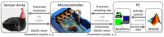 Optimization of the measurement chain with respect to sampling rate is achieved by minimizing register reading times, on-board processing, and the number of bytes transmitted to the PC. The sensor resolution and frame rate are set to their maximum values of 8200 cpi and 12,000 fps. The SPI frequency was set to 2 MHz and the baud rate to 115,200 bps. These modifications increase the system’s top frequency from about 62.5 Hz for one sensor unit [16] to approximately 1.3 kHz, to be distributed among all attached sensors.