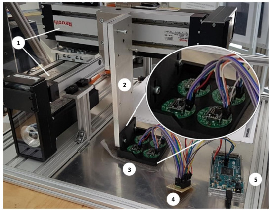 The system’s performance was evaluated on a bi-axial test rig. Two linear drives (Indradyn, Bosch Rexroth, Lohr am Main, Germany) were mounted perpendicular to one another. Motion was controlled by a Rexroth MTX 13V programmable open-loop control system. The rig moved a cantilever in the horizontal plane over a base plate. A bracket with four attached sensors was mounted to the cantilever and a patch of liner material placed beneath. In this testing phase, a wiring junction printed circuit board (pcb) was used to connect the sensor units to the Arduino. The described measurement setup is shown in Figure 2.