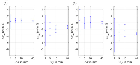 Mean (cross marker) and standard deviation (error bar) of the relative error for one sensor from (a) uni-axial and (b) diagonal movement. Velocities were combined at each distance. Calibration factors were = 2.018 and = 1.987.