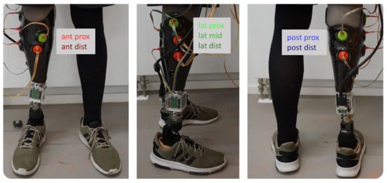 In addition to the presented measurement system, a custom-built measurement adapter [18] integrated into the prosthetic structure was used to measure the loads at the distal end of the socket with a sampling frequency of 500 Hz. The two systems were synchronized by a triggering signal provided by the adapter. Figure 4 shows the participant wearing the custom-built measurement socket with integrated sensor array as well as the adapter for measuring the occurring loads.