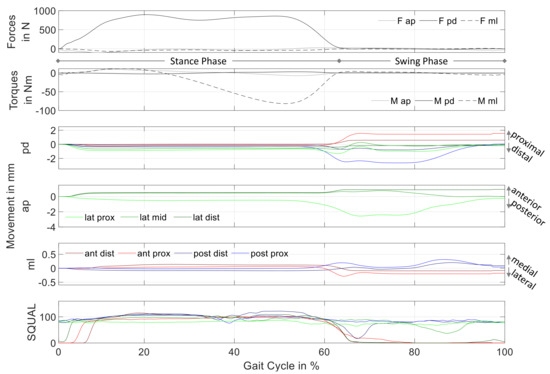 For reasons of clarity, Figure 5 shows the mean of all 54 gait cycles of the measurement data. The first two subplots summarize the external loads measured by the adapter, while the other subplots show data captured by the sensor array. Due to the different measurement sites, all sensors captured the relative motion in pd-direction, while anteroposterior (ap) and mediolateral (ml) movement was only detected by sensor units affixed in the Sagittal and Coronal plane, respectively. The bottom subplot shows the SQUAL-values of each sensor unit.