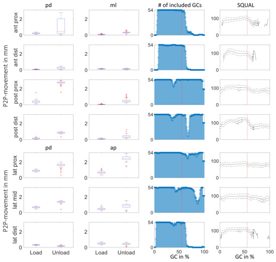 Figure 6 summarizes peak-to-peak (P2P) values measured during the loading (0–55% GC) and unloading (55–100% GC) phase of each gait cycle at the different sites as box plots. The first four rows show the movement of the residual limb inside the socket in the Coronal plane, while the last three rows depict movement in the Sagittal plane. Contrary to data shown in Figure 5, only measurement data of each time instant captured at a corresponding SQUAL-value between 50 and 150 were included in the analysis. The third column shows the subsequent number of included gait cycles at each instant of time. Additionally, mean ± standard deviation of SQUAL-values of included data are shown in the rightmost column. Vertical lines indicate to which box plot (load vs. unload) the data belong.