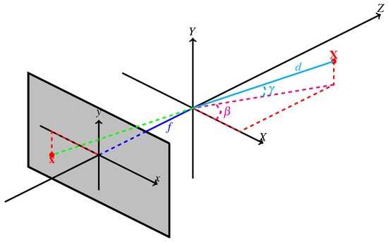 The pinhole camera model. A point is projected on the image plane in . d is the distance from to the camera center. and are the azimuthal and polar angles of the ray from through the optical center, respectively. f is the focal length of the camera.