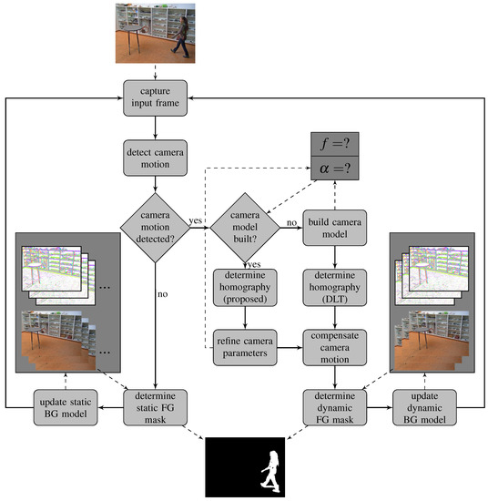 Most FGBG segmentation methods are built on the following principle: a model of the appearance of the background is learned and constantly updated. Given this model, a region in the image is classified as ‘foreground’ in locations where the current appearance differs significantly from the modeled appearance. As long as the camera position and orientation remain static, the background model can be locally tuned (whether automatically or not) to handle certain challenging conditions, such as dynamic backgrounds or changing illumination. However, once the camera starts rotating or tilting, it becomes difficult to adjust the entire background model to continue detecting foreground objects accurately, and standard motion compensation techniques are not sufficiently robust to overcome this issue [1,2].