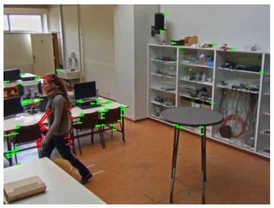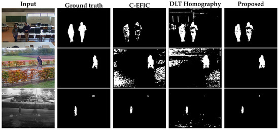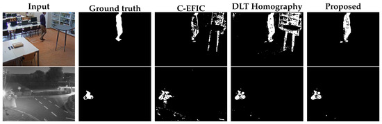 Finally, the proposed method was evaluated on the most relevant sequence in the public ChangeDetection.NET 2014 dataset, i.e., the fixed tilt ‘continuousPan’ sequence. Unlike in the self-captured videos, camera distortion was not removed, because the dataset only provides the undistorted test video and no distortion parameters. A fixed number of 50 feature points was selected in every frame. The proposed PFT method is compared to relevant state-of-the-art methods (both supervised and unsupervised) for whom the resulting foreground masks were available. We note that when using 50 feature points, using the DLT Homography or the proposed SPT method should yield very similar performance metrics. Quantitative results can be found in Table 2. A visual example is demonstrated in Figure 13.