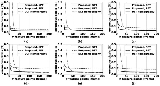 The selection for will be treated in more detail in Section 6.3, but we already briefly mention the basic idea to arrive at its value: on the one hand, when many feature points are used, a more robust estimate of the parameters can be found. On the other hand, since the parameters are not known in the beginning of the sequence, the proposed camera compensation mechanism (see Section 6 and beyond) cannot be used until f and are known, which potentially sacrifices the benefits of the proposed method early on if the optimization process can only start after a large portion of the sequence has already been processed. Furthermore, in the next section we will demonstrate an update mechanism for f and , to be used after their values are (initially) determined, enabling fast correction of a relatively poor initial estimate.