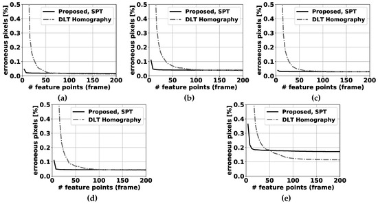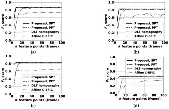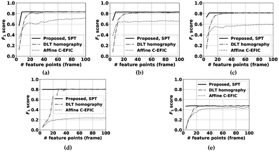 The proposed methods are again notably more robust for a low number of feature matches, as can be expected from the results in Section 8.1. However, the differences between the individual methods are much less pronounced in the score. Also, for 4 feature matches, the PFT method is superior to the SPT method, but above that the SPT method yields slightly better results. Once above 20 feature-point matches, the compensation error differences between the individual homography methods become negligible compared to the inherent score fluctuations introduced by the random background update mechanism. However, compared to the original C-EFIC method, the proposed methods are clearly superior for any given number of feature matches. Please note that the difficult night sequence yields lower scores overall compared to the other sequences.