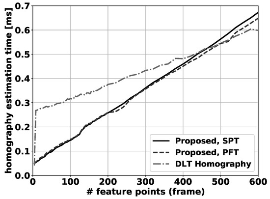 Average homography calculation time per frame, as a function of the number of feature points used in the calculation.