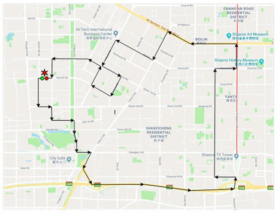 The field experiment method was selected to collect the driver’s physiology data and vehicle dynamic data for the purpose of estimating the driving risk during the lane-changing process. Data used in this study were collected in Xi’an City. As shown in Figure 1, the total length of the tested route was 26.6 km. The selected experimental route included urban freeways, arterials, and collectors, as well as intersections and interchanges. The speed limits of the urban freeways, arterials, and collectors were 70 km/h, 60 km/h, and 50 km/h, respectively. In total, 25 drivers were selected to finish the experimental route. All of them were healthy and had a driving age longer than three years, with an average number of kilometers traveled per year of more than 6000 km. Eight drivers were female. The experiments were carried out during peak hours (7:00–10:00 a.m., 3:00–6:00 p.m.) on eight sunny workdays. All the participants were asked to rest well the previous night. Tobacco, wine, tea, coffee, and any other food or drug that might affect the driver’s physiology indicators were forbidden on the previous day. Before the formal test, the participants were asked to take a 10-min test drive outside the driveway to familiarize them with the experimental vehicle and devices. The drivers’ physiological data (including the eye movement data and electrophysiology data) and vehicle dynamic data were collected as the input dataset of the driving risk prediction model. The eye movement information included eye fixation, saccade duration, blink frequency, pupil diameter, and field of front vision. The drivers’ electrophysiology data included an ECG and EMG. Meanwhile, we also collected the breath rate, oxyhemoglobin saturation degree, and blood pressure. The vehicle dynamic indicators included speed, acceleration/deceleration, real-time vehicle position, and the status of the various vehicle subsystems.