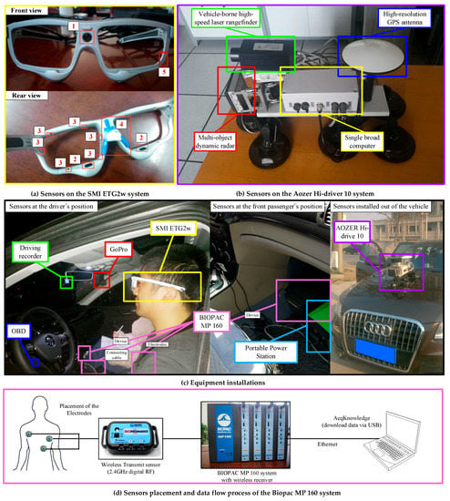 Both the diver’s physiological data and vehicle dynamic data are critical to our research. In order to improve the accuracy of the data, we chose some commercial sensors, which will be more reliable in the experiment process. The BIOPAC MP 160 physiological data acquisition system, SMI ETG 2w eye-tracking glasses, AOZER Hi-Drive 10 vehicle dynamic data acquisition system, and the OBD (on-board diagnostics) were selected in the experiment. The equipment installations on the test vehicle are illustrated in Figure 2.