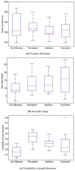 The fixation duration, saccade range, and variability of pupil diameter, which were obtained from the SMI ETG 2w eye-tracking glasses, were selected as the influence factors on driving risk. The fixation duration is the time of maintaining visual gaze on a single location. In medicine, the fixation duration represents the difficulty of capturing and processing visual information by the driver, which indirectly reflects driver fatigue. The saccade is a quick, simultaneous movement of both eyes between two or more phases of fixation in the same direction. In the driving process, the saccade range represents a driver’s visual angle. The driver is considered as being nervous when he/she has a large saccade range, which will lead to poor recognition of the road environment []. The diameter of the pupil controls the amount of light entering the driver’s eye, which may have a high correlation with driver fatigue []. However, it may also be affected by emotion or lighting.