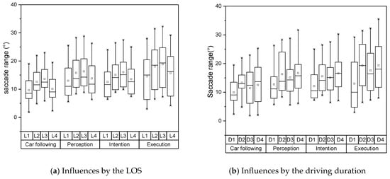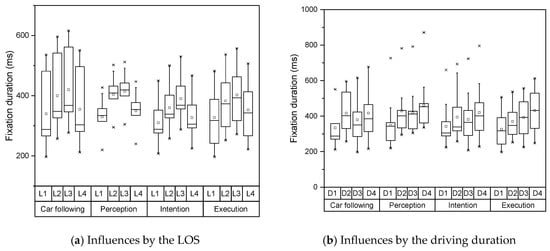 The distributions of these two indicators under each LOS and driving duration are shown in Figure 4 and Figure 5. Both fixation duration and saccade range represented disparate patterns under various LOS and driving duration. The fixation durations had large variances in both car following stage and execution stage, which demonstrated the drivers had limited information to observe. In contrary, the drivers needed to obtain more visual information during the perception stage and intention stage. They only spent little time on a single object. As the LOS increased under the unsaturated conditions, the fixation duration increased continuously. This means the drivers need longer fixation duration and large saccade range to extract effective information when external environmental information grows. Under the saturated condition, the tested vehicles constantly searched the chances to change lanes, which lead to the decline of fixation duration. Meantime, for the reason that there were fewer choices for the drivers, they represented a smaller saccade range under the saturated condition. With the increase of driving duration, both indicators and their variances showed a trend of increasing continuously. Both indicators showed different features at the interval of 40-80 mins. Based on the literature [], the driving duration of 80 minutes is the safe limit for monotonous highway driving, which may explain this extraordinary feature.