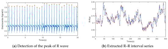 The ECG signal was extracted from AcqKnowledge software. As shown in Figure 6, the R wave peaks in the ECG signal were detected to obtain the time series of the R–R interval. Both LF power and HF power can be calculated using Welch’s method []. The SDNN and CV can be calculated directly using the R–R intervals during the lane-changing process. Unlike the eye movement characteristics, statistics of each parameter shown in Figure 7 indicate that the HRV parameters in both the perception stage and intention stage had similar patterns. Thus, the drivers were shown to be active in mind from the perception stage. However, their actions became active from the latter intention stage. Table 2 shows the influence of ECG factors on driving risk during the lane-changing process. Almost all the ECG indicators showed strong influences on the level of service during all lane-changing stages. However, the SDNN and CV represented a significant influence on driving duration, while the LF/HF showed very little influence. Based on the evaluations of ECG factors, the SDNN was selected as the input of the driving risk prediction model.