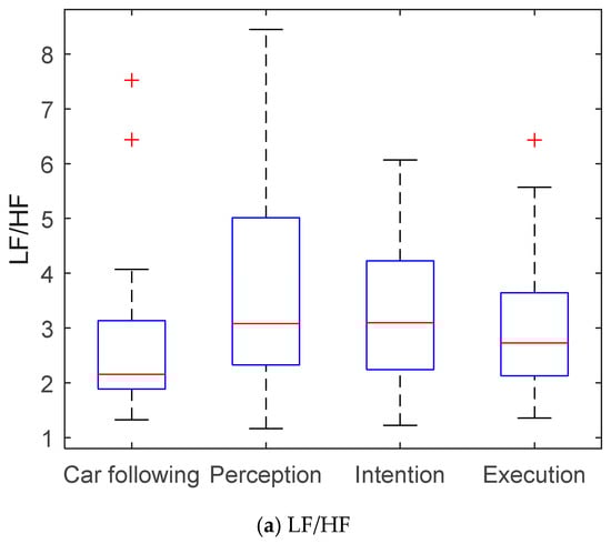 Heart rate variability (HRV) is the fluctuation in the time interval between adjacent heartbeats []. The heart rate variability can index the driver’s neuro-cardiac function during the lane-changing process. The HRV metrics can be described using both the time domain and frequency domain, which can be extracted from the electrocardiogram (ECG) morphology. The LF/HF (ratio of absolute power of the low-frequency band (LF) to that of the high-frequency band (HF), an HRV frequency-domain measure), the standard deviation of normal to normal R–R intervals of the heart rate (SDNN, an HRV time-domain measure), and coefficient of variation of the R–R intervals (CV, an HRV time-domain measure), which were obtained from the BIOPAC MP 160 system, were selected as the influence factors on driving risk. In medicine, larger time-domain metrics indicate a vigorous cardiopulmonary function, which means that the human body can adjust the amount of oxygen being transmitted to the organs by changing the heart rate based on the events happening during the driving process. The frequency-domain indicator LF represents the characteristics of the sympathetic nervous system, which has long-term effects on the driver’s physiological indicators related to cardiopulmonary function, while the HF represents the characteristics of the parasympathetic nervous system, which controls the driver’s reactions to incidents during the driving process. The LF increases and the HF decreases when the driving duration increases, i.e., the driver is transitioning to a fatigued state.