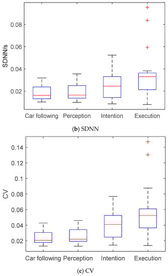Characteristics of HRV parameters of lane changing process. LF/HF—ratio of absolute power of the low-frequency band to that of the high-frequency band; SDNN—standard deviation of normal to normal R–R intervals of the heart rate; CV—coefficient of variation of the R–R intervals.