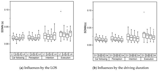 The distributions of SDNN under each LOS and driving duration are shown in Figure 8. The distributions of SDNN under each LOS and driving duration are shown in Figure 8. The SDNN in the car following stage and perception stage represented a relatively stable pattern, which meant the workload of the limb movement didn’t increase. The drivers began to be nerves and have certain physical movements when the lane changing process was turned into the implementation process. At this time, the driver’s heart rate might have greater variabilities. Similarly, the SDNN continued to decline when the LOS increases under the unsaturated state. This characteristic may relate to driving speed. With a lower LOS, the drivers would like to choose a high speed, which needs them to maintain an excited state. The drivers might become excited again when they decide to change lanes continually under the oversaturated state. As the driving fatigue will accumulate continuously as the driving duration increase, the SDNN of each lane changing stage will decrease respectively.