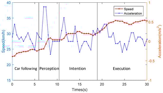 The average vehicle speed and acceleration, which were obtained from the AOZER Hi-Drive 10 vehicle dynamic recording system, were selected as the influence factors on driving risk in the field of vehicle dynamics. The variations of the vehicle speed and acceleration during one specific lane-changing process are shown in Figure 9. The speed and acceleration data indicate that the drivers implemented operations on their vehicles only from the execution stage. As shown in Table 3, the two-factor indicators during all lane-changing processes were calculated. It can be judged from Table 3 that the average speeds of all events were significantly affected in the fields of the level of service and driving duration. The acceleration factors had a strong influence on the level of service, and almost had no effect on driving duration. Thus, the average speed was selected as the input of the driving risk prediction model. The distributions of average speed under each LOS and driving duration are shown in Figure 10.