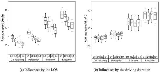The Highway Capacity Manual (HCM) divides the LOS into six levels: LOS A as the free flow, LOS B as the reasonably free flow, LOS C as the stable flow, LOS D as the approaching unstable flow, LOS E as the unstable flow, and LOS F as the forced or breakdown flow. To reduce the complexity of analysis, we combined the LOS with a similar pattern of the indicators into free flow (LOS I, corresponding to LOS A and B in the HCM), stable flow (LOS II, corresponding to LOS C and D in the HCM), unstable flow (LOS III or LOS E in the HCM), and forced or breakdown flow (LOS IV or LOS F in the HCM). Literature shows that the safe limit for monotonous highway driving is 80 min [] and the drivers should take a break every 120 min []. Thus, we classified the driving duration into four groups: less than 40 min, 40–80 min, 80–120 min, and greater than 120 min.