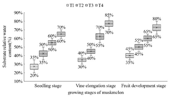 Substrate relative water content (%) in four treatments at three growing stages of muskmelon. T1: 20%~35% relative water content (RWC) at seedling stage, 30%~40% RWC at vine elongation stage, and 35%~45% RWC at fruit development stage. T2: 35%~50% RWC at seedling stage, 40%~50% RWC at vine elongation stage, and 45%~55% RWC at fruit development stage. T3: 50%~60% RWC at seedling stage, 55%~70% RWC at vine elongation stage, and 55%~65% RWC at fruit development stage. T4: 60%~70% RWC at seedling stage, 70%~85% RWC at vine elongation stage, and 65%~80% RWC at fruit development stage.