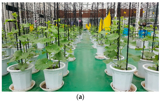 Experiment I was conducted in the greenhouse of Shanghai Zealquest Technology Co., Ltd, China (GPS coordinate: 31°11′N, 121°36′E) from April to July in 2016. The experiment II as model validation was conducted in a multiplan greenhouse at Shanghai Jiaotong University, China (31°11´ N, 121°36´E) from August to November in 2016, and the glasshouse heating, ventilation, and internal and external shading were all automatically regulated by Priva Software (Priva Company, Zuid Holland, the Netherlands) in these two experiments. Two cultivars of netted muskmelon, “Wanglu” with dense nettings and “Arus” with sparse nettings, were used in these two experiments. The muskmelon seedlings were first cultivated in plug at greenhouse, and then transplanted to pots at two-leaf and one-half stage. The muskmelons were vertically planted in pots with a total volume of 16 L of substrate containing 2:2:2:1 mixture of meteorite/perlite/peat/organic fertilizer. The bulk density and saturated water content were 0.21 g/mL and 140%, respectively.