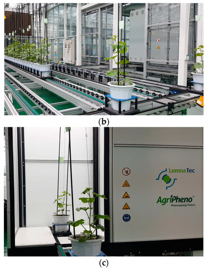 (a) Test site of plant cultivation, (b) automatic plant conveyors system, (c) Lemnatec 3D phenotyping system.