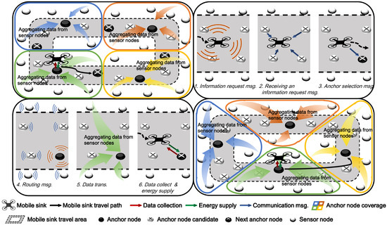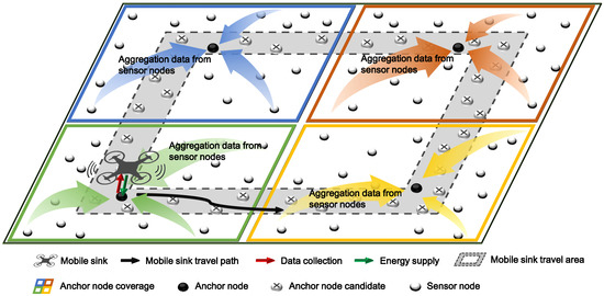 In this paper, we propose a scheme to mitigate energy shortages in hotspots and collect data efficiently by selection and management of anchor nodes in energy-harvesting WSNs using drones as mobile sinks and energy chargers simultaneously. The drone that has limited energy cannot visit all sensor nodes, anchor nodes temporarily collect data from other sensor nodes, and the mobile sink can collect data of the entire network by only visiting the anchor nodes. In this scheme, the anchor nodes are selected dynamically at runtime by the mobile sink at the beginning of a round, the sensor nodes transmit sensed data to anchor nodes periodically, and mobile sinks travel through predefined paths to receive the aggregated data from anchor nodes. Consequently, the anchor nodes consume more energy than the other sensor nodes, but the mobile sink supplies the energy needed so that anchor nodes do not suffer outages. The numbers and locations of the anchor nodes are dynamically determined by calculating the energy of the mobile sink and the node consumption before a mobile sink traverses the network to collect data, and the next anchor node is selected from the next anchor candidate area while the sink is traveling. This scheme is designed for a delay tolerant network in which transmission delay is not important, such as environmental monitoring, and data can be efficiently collected in subject areas that are inaccessible to automobiles or people, such as in volcanic areas, deep underwater, and isolated ecosystems. Figure 1 shows an overview of the proposed scheme.
