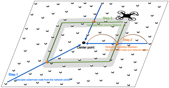 However, no matter how large the network size, the path length of the drone cannot be longer than the maximum flight distance of the drone owing to the limited endurance of the drone. If the path of the mobile sink set as mentioned above is longer than the maximum flight distance, the mobile sink should change it to a short enough distance to travel. At this time, the mobile sink’s travel path must be set closer to the network center, allowing the mobile sink to successfully traverse the network. In this case, since the number of data transmission hops of the sensor nodes may be longer, the overall performance of the network can decrease. Therefore, we should reduce the number of hops using multiple drones or a method such as dividing the network into small areas when the network is large. In addition, when selecting the drone’s travel path and anchors in the above method, the number of nodes transmitting data to the anchors can be varied according to the location of anchors. For instance, if the shape of network field is a rectangle, the anchors at the corner of the rectangle can receive more data than other anchors. Conversely, if the network field is circular, all anchors receive the similar amount of data. We have determined the travel path of the drone in the similar method as the railroad scheme to support diverse networks fairly. Figure 2 shows how to determine the path for a mobile sink.
