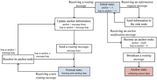 All sensor nodes transmit their data to the selected anchor and the transmission path becomes the reverse path of the routing message. However, if new anchor nodes are selected during data transfer, data can be transferred to the previous anchors. In this case, the previous anchors store it and then, send it to the new anchors with their own sensing data when they receive the routing messages from the new anchors. Figure 7 depicts the anchor selection and routing process flowchart.