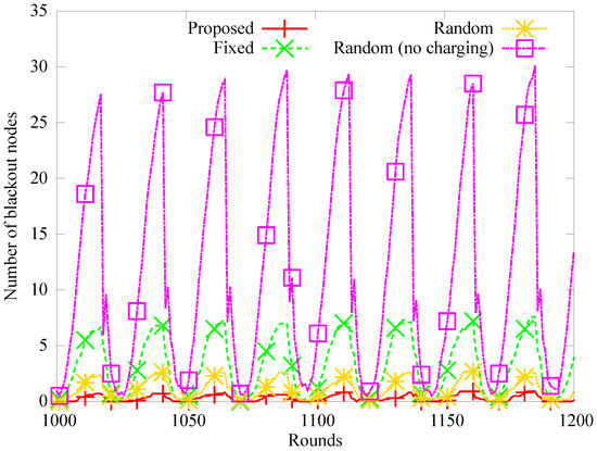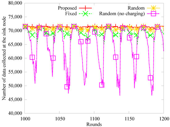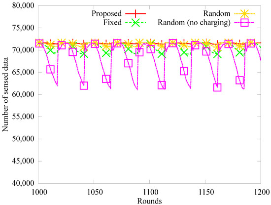 Figure 8, Figure 9 and Figure 10 show the number of blackout nodes, the quantity of data sensed, and the quantity of collected data for approximately eight days (from 1000 to 1200 rounds) with node density of 0.04. Because the sensor nodes use solar energy, the number of blackout nodes is low during the daytime, but the energy is not recharged at night, so the number of blackout nodes increases in Figure 8. Specifically, the random (no charging) scheme that does not use WPT, experiences a higher number of blackouts than the other schemes during nighttime. In the fixed method, the position of the anchor nodes does not change even though they can be charged with WPT, therefore, blackouts occur more frequently owing to the hotspot problem. In the proposed and random scheme, the number of anchor nodes and the amount of charging energy are appropriately adjusted. However, fewer blackouts occur in the proposed scheme than in the random scheme. The amount of sensed data decreases as the number of blackout nodes increases, as shown in Figure 9. On the other hand, in Figure 10, the amount of data collected by the mobile sink node is much lower than the amount of sensed data in the random scheme, because as shown in Figure 9, many relay nodes around the anchor nodes experience blackouts owing to the hotspot problem.
