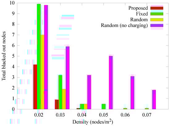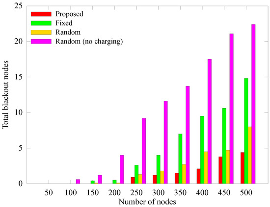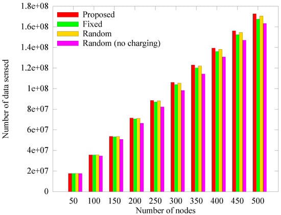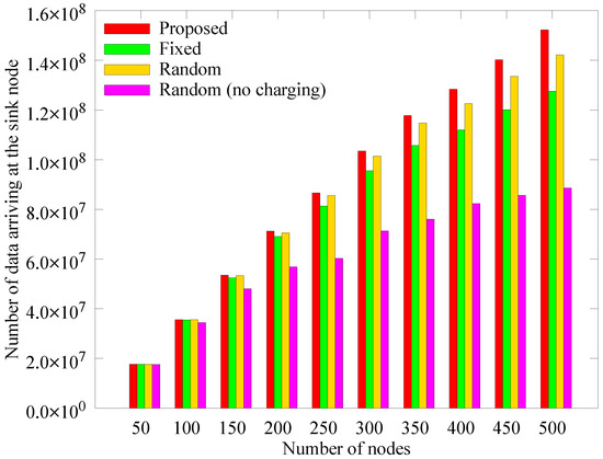 Figure 11, Figure 12 and Figure 13 respectively depict a comparison of the number of blacked out nodes, data collected by the sink, and sensed data according to the number of nodes, which is varied from 50 to 500 in 50 unit intervals with node density of 0.04. These results are measured at 1000 rounds. In Figure 11, as the number of nodes increases, an anchor node must aggregate more data, which leads the hotspot problem. As a result, the number of blackout nodes increases. In the random (no charging) scheme which does not use WPT, the number of blackout nodes increases drastically because the anchor nodes cannot handle all the transmitted data. In the fixed scheme, even though the energy required to select the anchors is saved because the anchor nodes are fixed, the blackout of anchor nodes rapidly increases owing to the hotspot problem. In contrast, the proposed scheme is less affected by the number of nodes. The reason is that the proposed scheme appropriately selects the numbers and locations of anchors and determines the proper amount of energy to deliver. As discussed in Section 4.2.1, Figure 12, illustrates the increase in the amount of sensed data as the number of nodes increases, and Figure 13 shows that the amount of data collected does not increase significantly despite the increases in blackouts. However, the proposed scheme can adaptively collect larger amounts of data, regardless of the number of nodes.