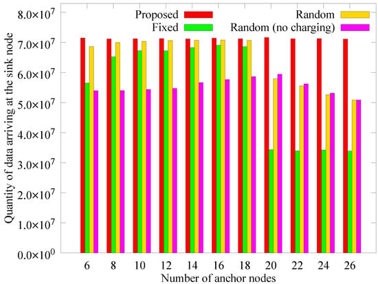 However, as the number of anchors increases from 20 to 26, the number of blacked out nodes decreases. This phenomenon is because the transmission hop count of sensor nodes is reduced due to the distributed anchors. Figure 18 and Figure 19 respectively present the change in the quantity of sensed data and the quantity of data received at the sink as the number of anchor nodes changes. Similar to when the number of blackout nodes increases, when the number of anchor nodes increases, the quantity of collected data gradually increases, and when the number of anchors exceeds a limit, the quantity of collected data decreases rapidly. This is because, similar to the comparison of the number of blackout nodes, the mobile sink has no available energy left to charge the rear anchor nodes. The proposed scheme determines the number of anchor nodes according to the network environment. In the random scheme, when the number of anchor nodes reaches 18, the number of blacked out nodes reaches its minimum. This result supports our argument that the proposed scheme dynamically determines the proper number of anchor nodes.