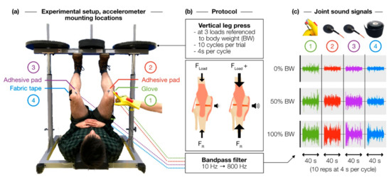 All human subjects research was conducted under approval from the Georgia Institute of Technology Institutional Review Board. Eleven healthy subjects (seven male/four female, 25.1 ± 2.5 years, 71.4 ± 16.5 kg, 177.5 ± 11.4 cm) with no history of major knee injury were asked to perform a vertical leg press exercise at three loading conditions referenced to body weight (BW)—0% BW, 50% BW, and 100% BW—while the joint sound signals from both knees were recorded simultaneously by four accelerometers—two on each knee. The accelerometer placement scheme is shown in Figure 1a. These locations have been shown to be effective for capturing the vibrations internal to the knee, and, importantly, they are anatomical landmarks that are easy to locate and provide relatively unimpeded (i.e., by muscle and fat) access to the internal joint space [14]. One accelerometer was affixed lateral to the patellar tendon of the left knee using fabric tape (Kinesio Tex, Kinesio, Albuquerque, NM, USA). Two accelerometers were affixed medial to the patellar tendon of both knees using double-sided adhesive foam microphone pads commonly used for skin-mounting lavalier microphones (23 mm Stickie, Rycote, Gloucestershire, UK). These sensors, attached to the corresponding locations on either knee using the same mounting technique, served as a matched comparison to indicate whether a subject’s left and right knee produced disparate results; in this case, a comparison across all four accelerometers would be invalid. Both the fabric tape and microphone pads have been used previously [11,12,14]. Finally, an accelerometer on the index fingertip of the glove was placed against the right knee lateral to the patellar tendon. For consistency, the glove-based acquisition was performed by the same individual for all subjects.