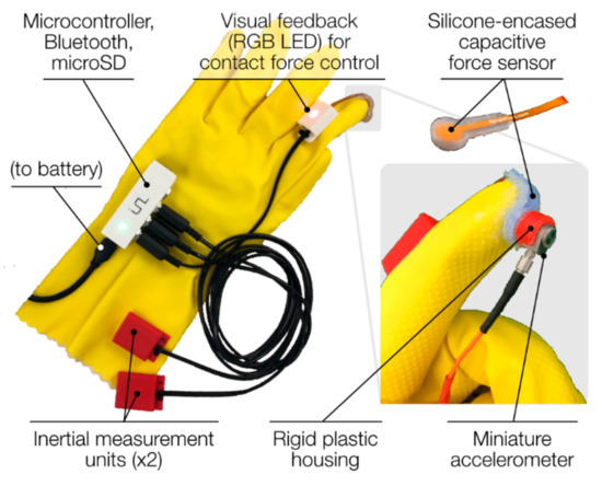 Design of a glove with embedded sensors for capturing joint sounds (accelerometer) and other contextual signals (inertial measurement units for limb motion, capacitive force sensor for sensor–skin contact pressure).