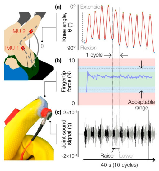 Sample time-series waveforms of signals collected by the glove system during a single experiment trial, consisting of 10 vertical leg press cycles. (a) IMUs were used to confirm that consistent knee range of motion (in degrees, °) was achieved at a constant cadence and to segment the joint sound signal into individual cycles. (b) Contact force (in N) at the fingertip was measured to confirm a consistent amount of pressure was applied. (c) The joint sound signal (local acceleration, in g) was captured by a fingertip-mounted vibration sensor and segmented into cycles consisting of extension (“raise”) and flexion (“lower”) phases.