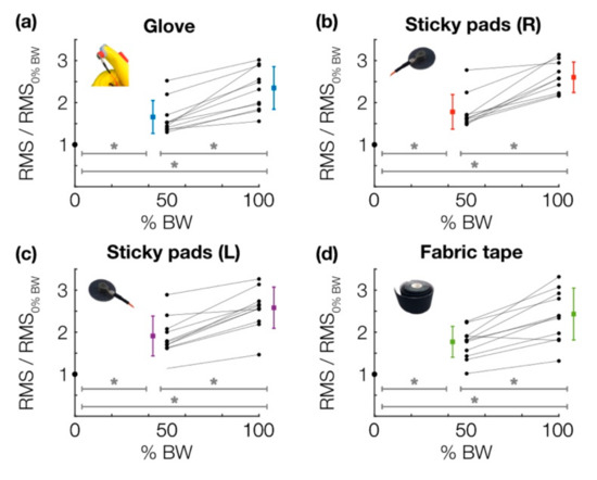 Relative grinding loudness vs. % body weight applied for each mounting technique, including (a) the instrumented glove, (b) adhesive microphone pads mounted on the right leg, (c) adhesive microphone pads mounted on the left leg (for determining comparability between left and right knees), and (d) fabric kinesiology tape. Across 11 subjects, each mounting technique demonstrates the same trend: a monotonic, significant increase in baseline-normalized RMS with increasing vertical load. (*) indicates significance (p < 0.01) as determined by paired Student’s t-test with Holm–Bonferroni correction.